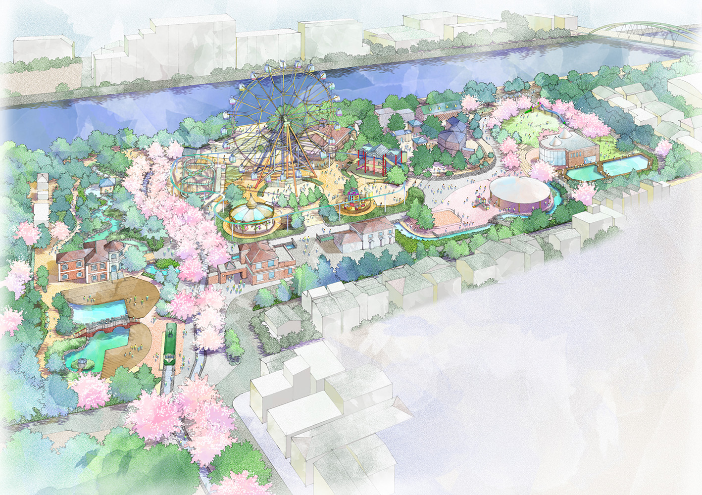 This is a bird's eye view of a renovation concept for a public amusement park along the Arakawa River in Tokyo.